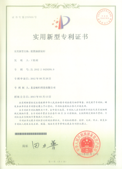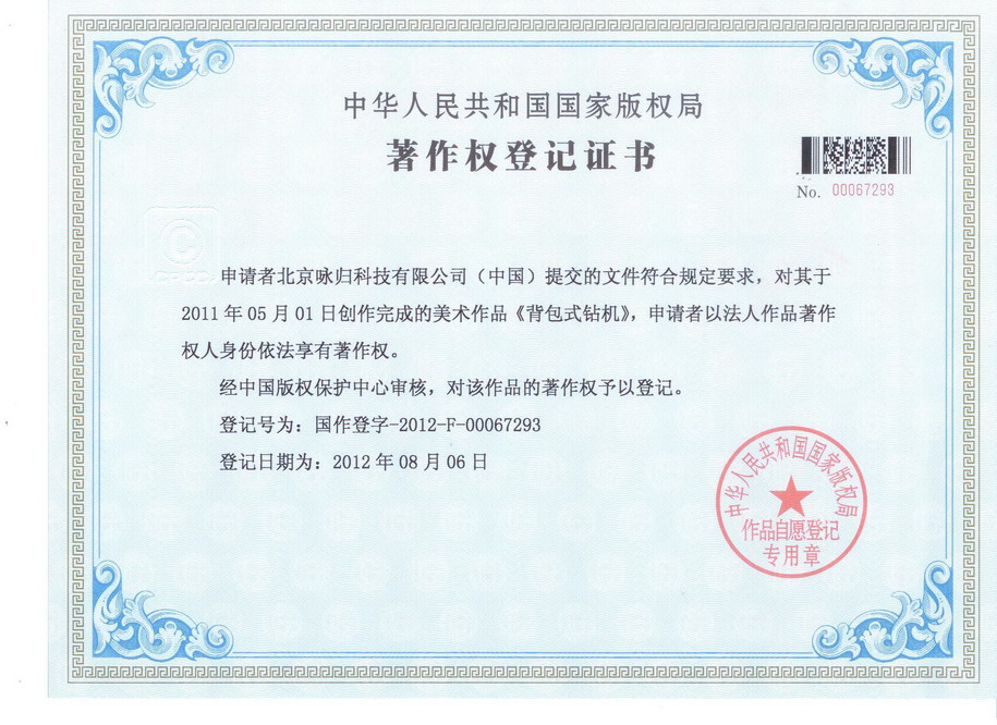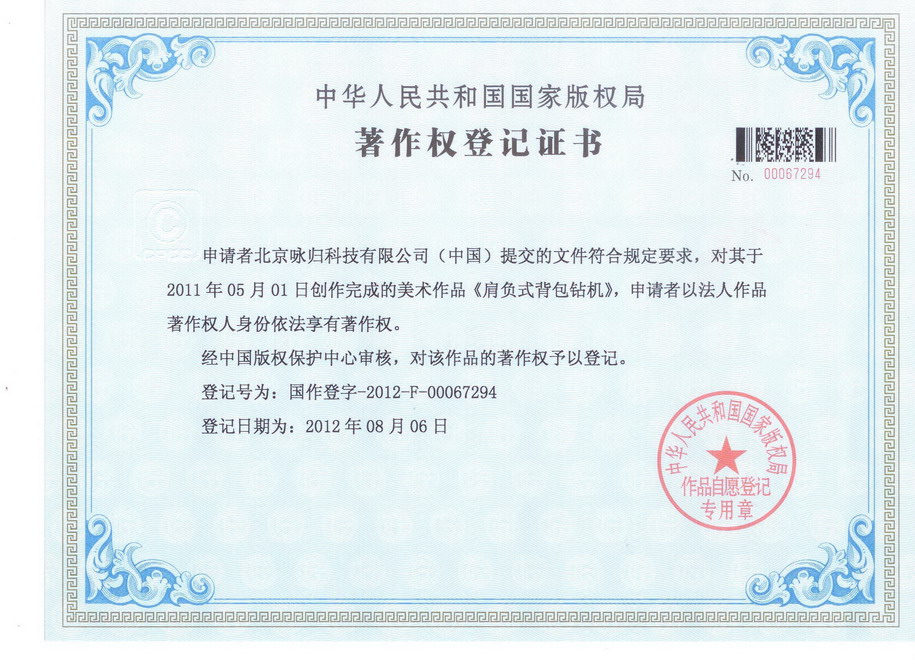 著作權(quán)登記證書--肩負(fù)式背包鉆機(jī)